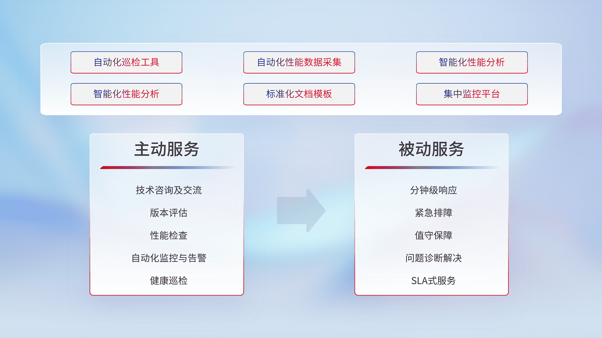 智能化工具和标准化文档,,,保障服务质量,,提供主动服务(包含技术咨询、、版本评估、、性能检查、、、自动化监控与告警、、、、健康巡检)和被动服务包含(分钟级响应、、紧急排障、、、、值守保障、、问题诊断解决、、、、SLA服务)。。